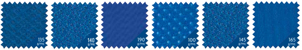 | B-HIVE 100 % polyesteri | FUTURE 100 % ployesteri | MALAGA 80 % polyamidi, 20 % elastaani | MESH 6TP 100 % polyesteri | MUNDIAL 100 % polyesteri | PREMIER 82 % polyesteri, 18 % elastaani |